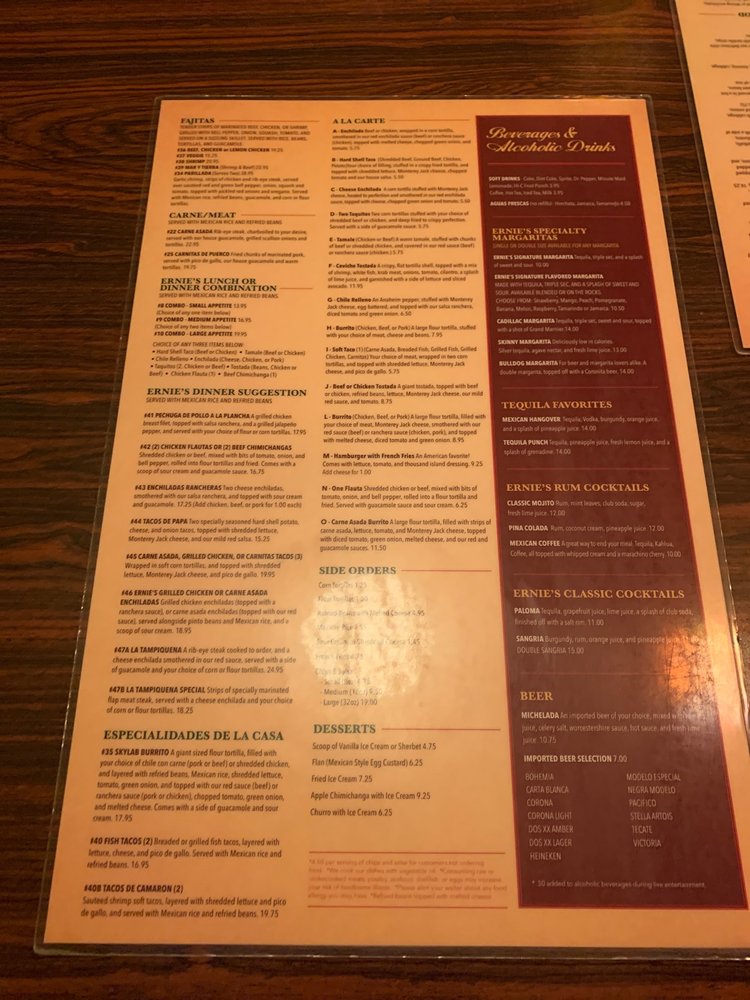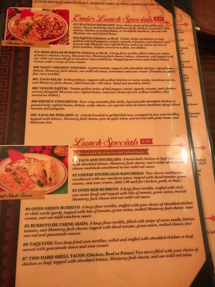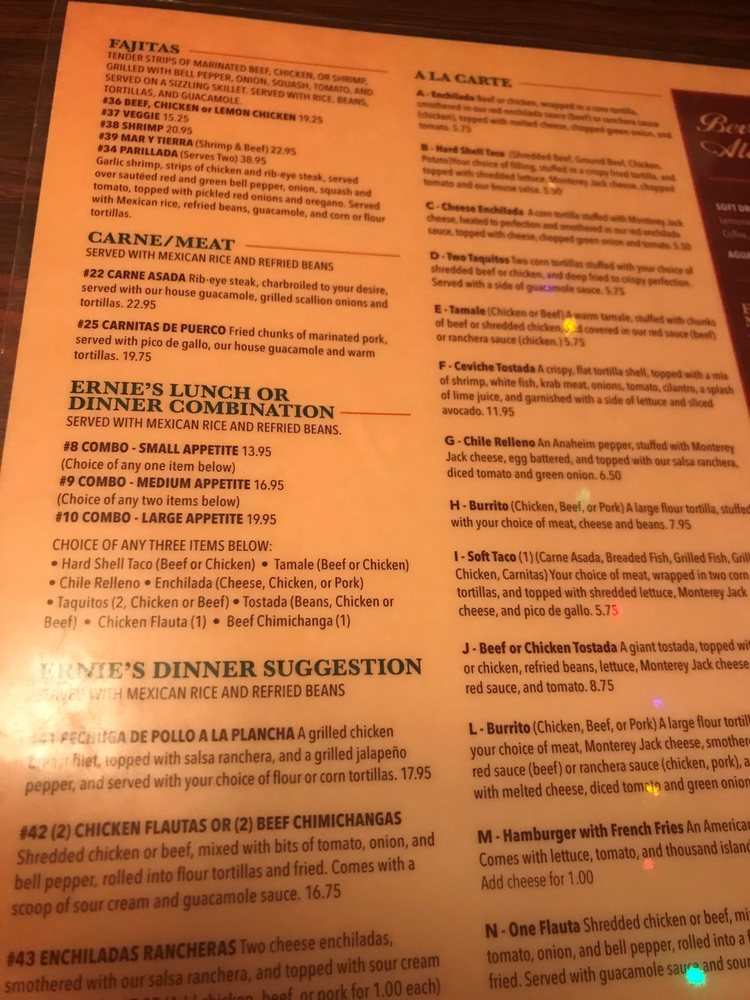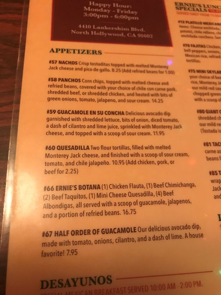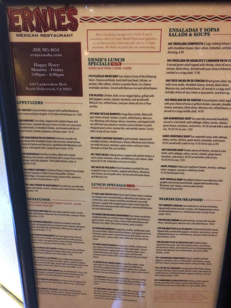 Ernie's Mexican Restaurant, located in North Hollywood, CA, offers a casual dining experience with a wide range of amenities, including vegan options, wheelchair accessibility, and a full bar. Customers rave about the attentive service from staff like bartender Emilio, who is knowledgeable about the menu and serves up delicious margaritas. The menu features flavorful dishes like La Tampiqueña and cheese enchiladas, with generous portions that satisfy both adults and kids. The salsa packs a spicy punch, and the drinks are a hit with patrons. Whether you're looking for a fun night out with the family or a solo dining experience, Ernie's delivers on good food, great service, and a welcoming atmosphere. Don't miss out on the opportunity to try this Latinx-owned gem in the heart of North Hollywood.